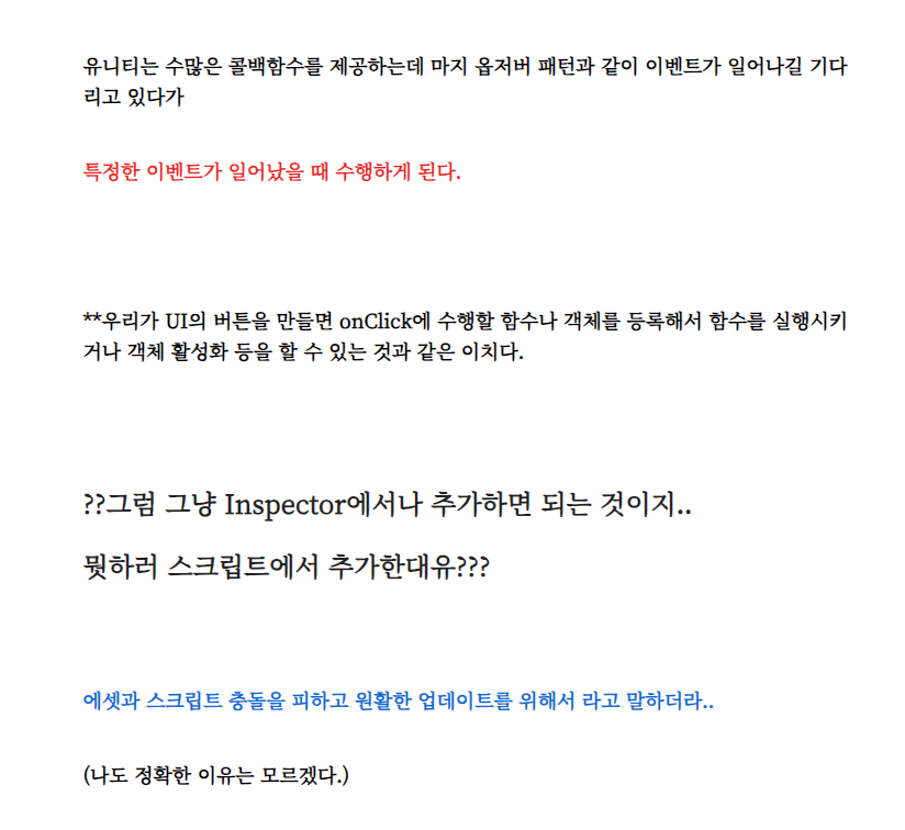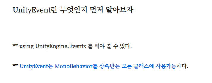 오늘 나의 무능함을 느끼고.. 공부를 다시 시작해본다. 너무 우울하다. 서론이 길었다. 알아보자 UnityEvent란 무엇인지 먼저 알아보자 ** using UnityEngine.Events 를 해야 쓸 수 있다. ** UnityEvent는 MonoBehav